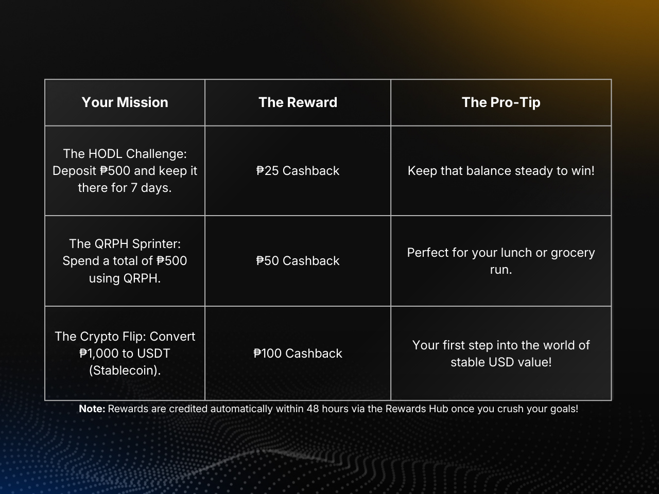 Why just join when you can win? We’ve lined up some serious Cashback Rewards for our new users. Whether you’re a crypto pro or a digital wallet newbie, these missions are designed to put money back in your pocket: